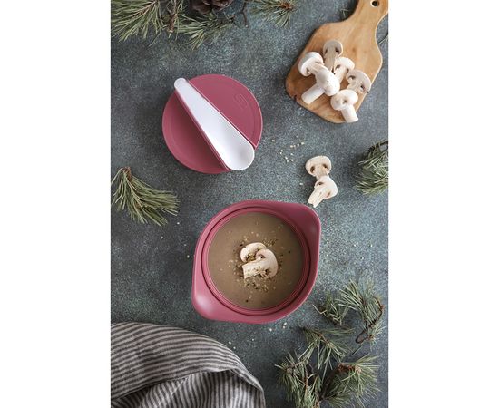 Вакуумная крышка плотно прилегает к основе, не дает даже капле просочиться наружу. А специальный дизайн супницы и двойные стенки позволяют без проблем держать ее в руках, даже если внутри очень горячая еда. В комплекте идет ложка, которая аккуратно и надежно закрепляется на крышке супницы.